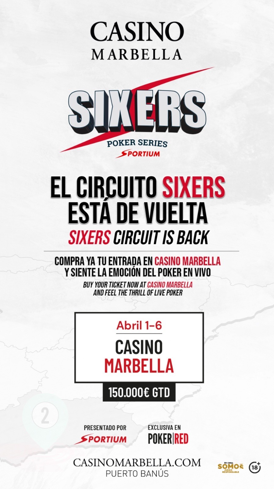 Recorriendo los mejores casinos de España, Sixers vuelve a la Costa del Sol, eligiendo en esta ocasión, Casino Marbella como escenario. Con un programa completo que incluye 11 torneos y un garantizado de 150.000€, esta segunda edición promete acoger a los mejores jugadores de poker.